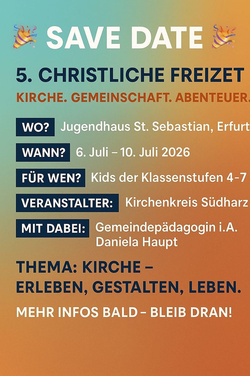 Dann komm mit auf unsere Kinder-Ferienfreizeit nach Erfurt! Vom 6. bis 10. Juli 2026 sind wir im Jugendbildungshaus St. Sebastian untergebracht und erleben gemeinsam eine abwechslungsreiche und erlebnispädagogisch wertvolle Ferienwoche.