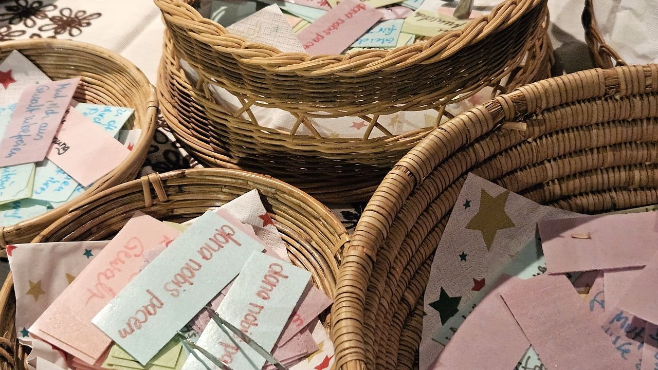 Gemeinsam mit ihren Kindern hatte sie zuvor süßes Esspapier beschriftet, das im Gottesdienst als Wandelabendmahl durch die Reihen ging. Beschriftet war es mit dem, was den Sängerinnen wichtig ist, was sie bewegt, gesammelt während der Proben im Vorfeld. Und die Pfarrerin bat eindringlich: "Kaut es richtig durch, schluckt es nicht einfach runter, das Weh und Ach der Familien."