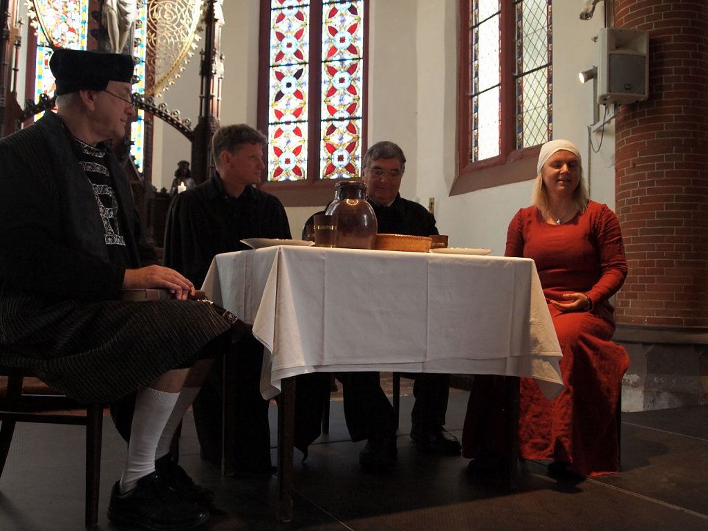Ehepaar Heike und Carsten Stenger gaben die Katharina Luther und den Melanchthon, wobei er zudem noch in die Rolle einer modernen Person schlüpfen musste. Bürgermeister Klante, der ursprünglich eine Rolle hat übernehmen wollen, war wegen Krankheit leider kurzfristig ausgefallen. Den Luther gab Oberförster i.R. Arndt Petsch und als zweiter moderner Mensch war Sebastian Gerecke zu sehen.