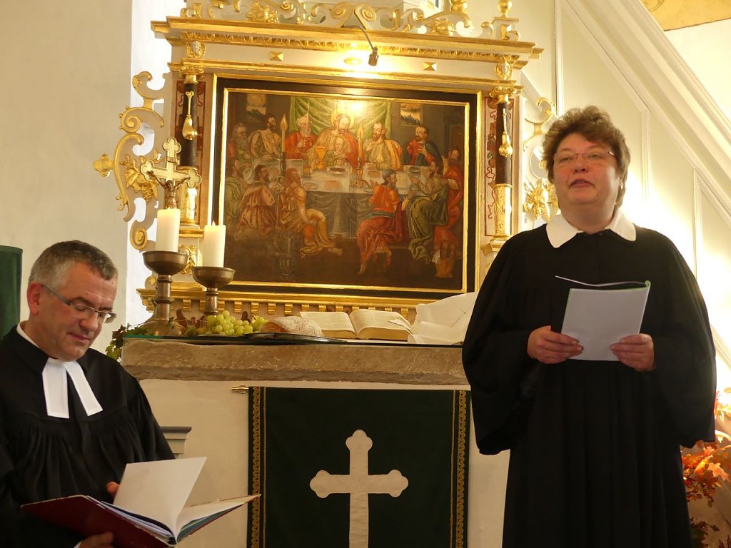 Viele Pfarrerinnen und Pfarrer hatten sich am Sonntag in Epschenrode eingefunden, um gemeinsam Gottesdienst zu feiern. Die ordinierte Gemeindepädagogin Silvia Pavlicek, die für den Pfarrbereich Trebra zuständig ist, Ulrike Kosmalla, Pfarrerin des Pfarrbereichs Großbodungen, Pfarrer Nikolaus Flämig, der heute seinen Dienst in Meiningen tut sowie Pfarrer i.R. Neubert und seine Frau, die Lektorin Hildigund Neubert. Eine große Zusammenkunft für ein großes Ereignis.