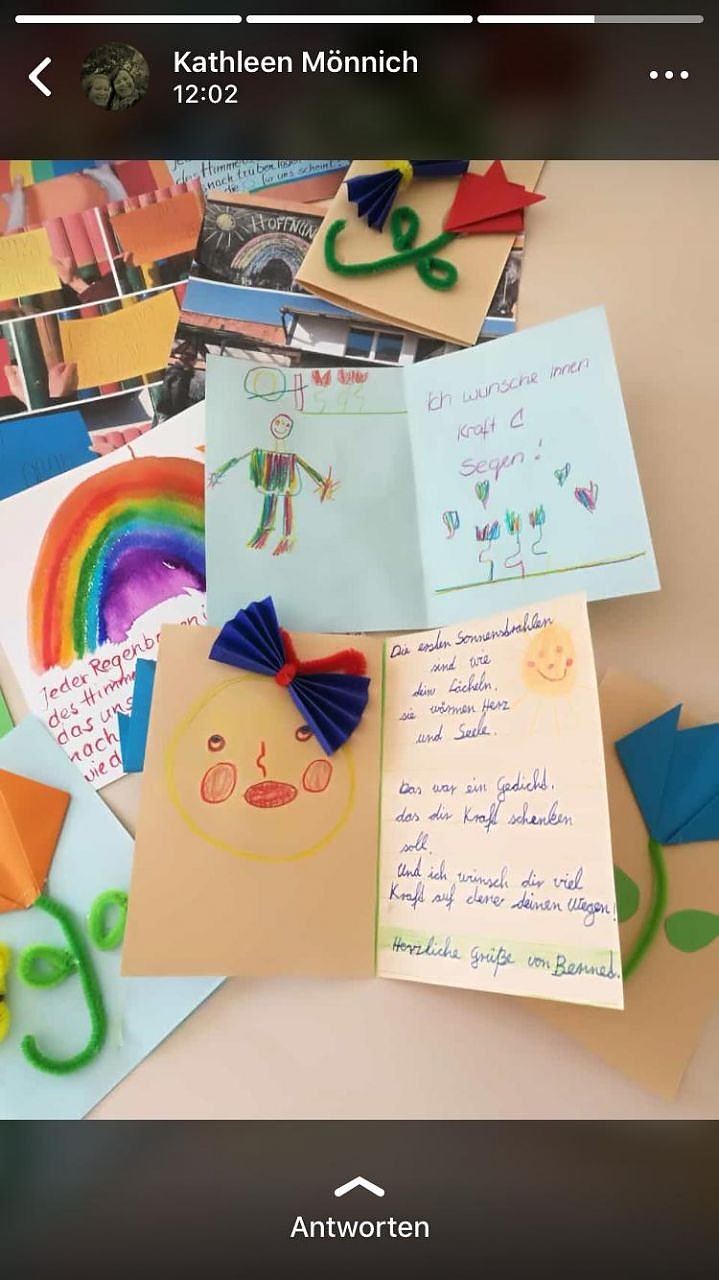 2. Im Anhang findet ihr ein Bild von Karten, die Kinder in den letzten Tagen gemalt und beschrieben haben für die Bewohner von Altenheimen, die im Moment keinen Besuch bekommen dürfen. Bisher haben wir viel zu wenige Karten um alle Altenheime unserer Stadt zu bedenken. Deshalb wollen wir euch bitten, noch weitere Karten zu basteln und zu schreiben.