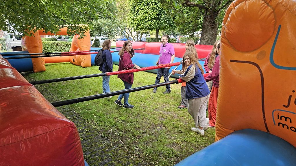 | Riesiger Menschen-Kicker (human soccer), Fußball-Klettwand & Piraten-Hüpfburg | auf dem Marktplatz | |