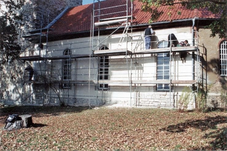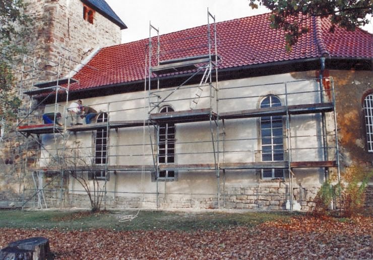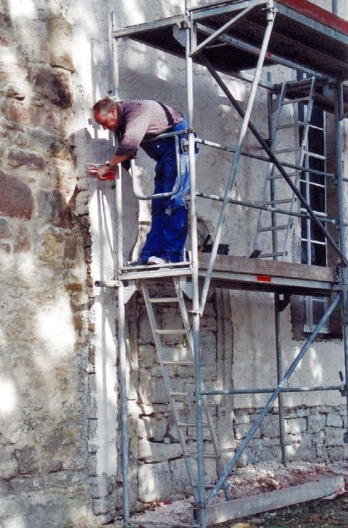 Mit finanzieller Unterstützung des Südharz-Kirchenkreises konnte im Jahr 2008 mit der Südfas-sade begonnen werden. Mit Erstellung des Gerüstes ging es endlich los. Das Abnehmen der Reste des früheren Gipsputzes, der mindestens 150 Jahre alt war, hat die Probleme im Mauer-werk offengelegt. Man konnte viele Spuren von früheren Bauabschnitten und Mauerwerksschä-den sehen. Die Mauerwerksreparatur hat den Beteiligten ein erstes Mal den handwerklichen Aufwand offengelegt. Das was angefangen ist, das muss auch zu Ende gebracht werden. So geht es halt in Kehmstedt. Es ist schön, wenn man sieht, wie viele fleißige Hände auf dem Ge-rüst standen und geholfen haben. Unter der Mitarbeit des Architekten konnte dann der Hoch-brandgipsmörtel angemischt und aufgetragen werden. Ein Handwerk, dass auch in Kehmstedt erst wieder neu belebt wurde.