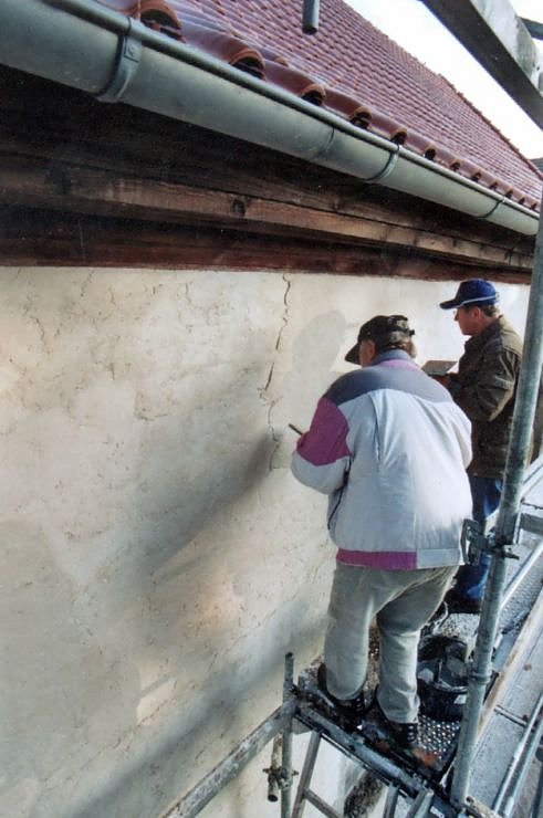 Das Anlegen von Probeflächen an der Südfassade wurde mit besonderer Aufmerksamkeit ver-folgt. Der erstmalige Umgang der Kehmstedter mit dem Hochbrandgips hat einmal die hand-werklich Beteiligten aber auch die Denkmalbehörden überzeugt. Die denkmalrechtliche Ge-nehmigung konnte erteilt werden.