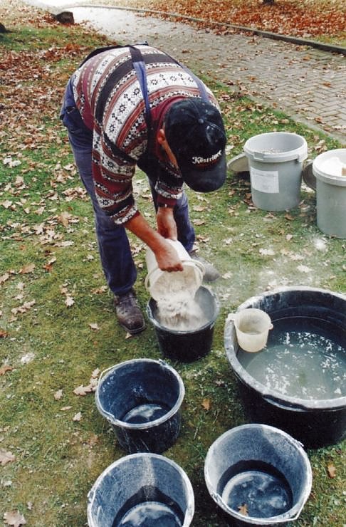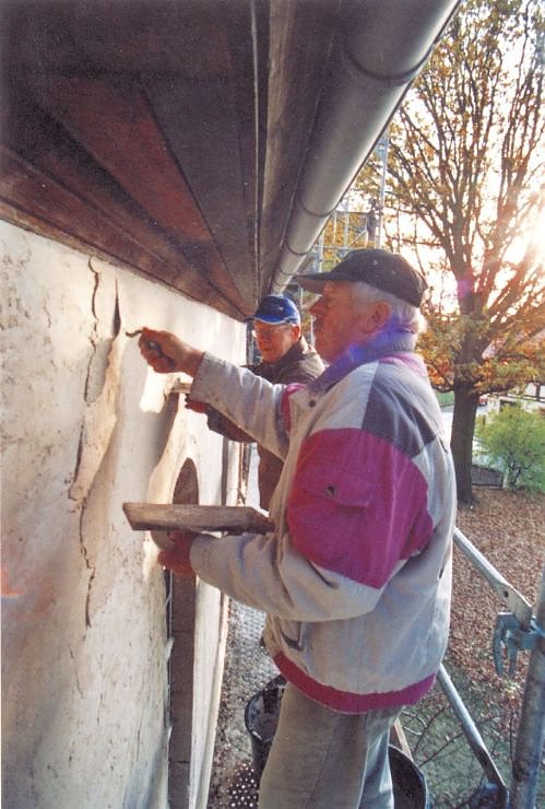 Der Architekt, Gerd Srocke, konnte auf Grundlage von langjährigen Erfahrungen dem Gemein-dekirchenrat und den ehrenamtlichen Helfern den Umgang mit dem historischen Gipsmörtel erläutern. Auf Grund des Wissensstandes in der Öffentlichkeit war und ist es vor allem schwer vorstellbar, die notwendigen Maurer- und Putzarbeiten am Kirchturm und Kirchenschiff mit ei-nem Gipsmörtel auszuführen.