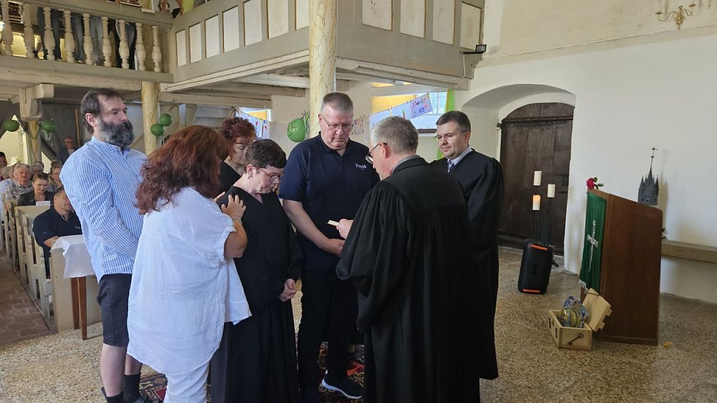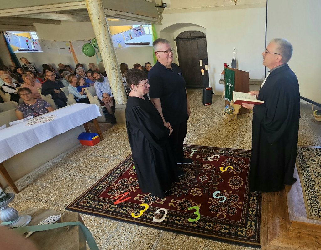 Bunt hingegen waren die Geschenke, die Ines Delert mit auf den Weg bekam – vom gemeindepädagogischen Team, dem Kirchenkreis und vor allem aus den Gemeinden. Da gab es die eindrückliche Pantomime der GKR-Vorsitzenden Alice Schulz, den Song von Luisa und Erik, die große geschmückte Festwiese mit Leckereien vor dem Pfarrhaus und die Ausfahrt mit einem Oldtimer zum Abschied. Doch so ganz ist Ines Delert nun doch nicht verschwunden. Erste Termine, wie für Heiligabend beispielsweise, hat sie wohl schon angenommen, wird gemunkelt. Doch auch der Liegestuhl, den die Gemeinde ihr schenkte, soll reichlich zum Einsatz kommen.
