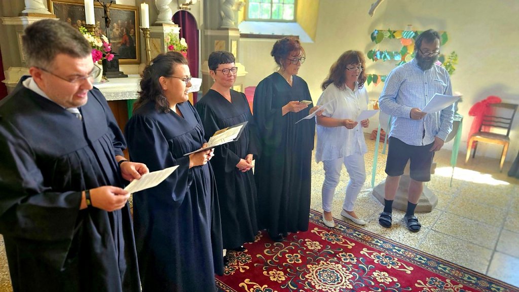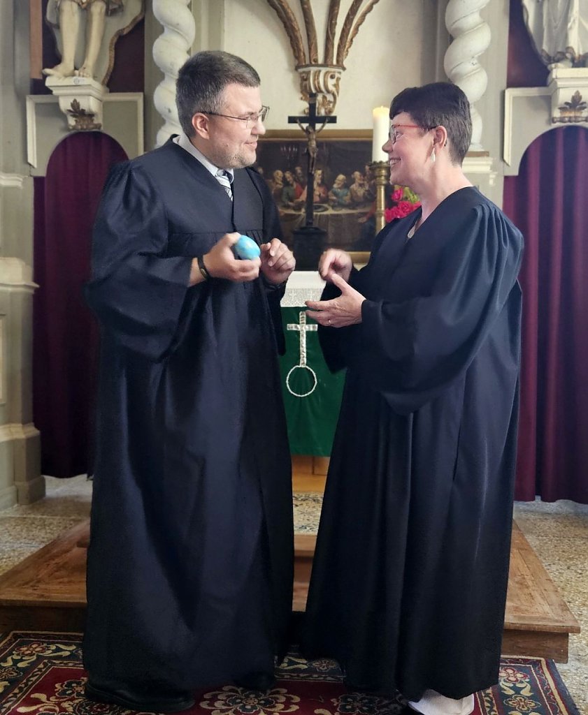 Die Gemeindepädagogik sei im Umbruch, wie die kirchliche Landschaft insgesamt, betont er. Den Gottesdienstbesuchern fiel als erstes eine optische Veränderung auf. Das gemeindepädagogische Team erschien fast ausnahmslos in neuen Talaren – schwarz, wie der der Pfarrerschaft, jedoch mit spitzem Ausschnitt und ohne Beffchen oder Stola.