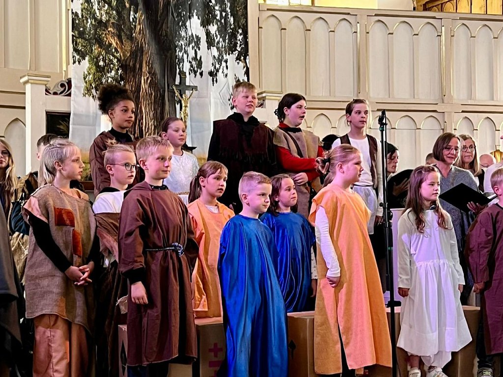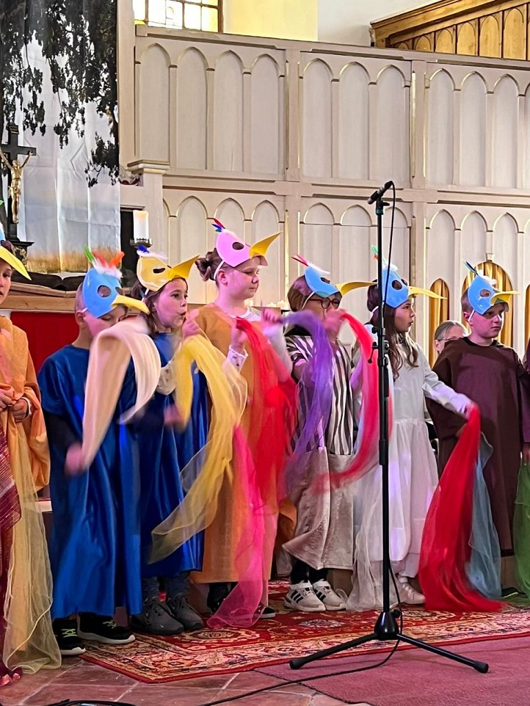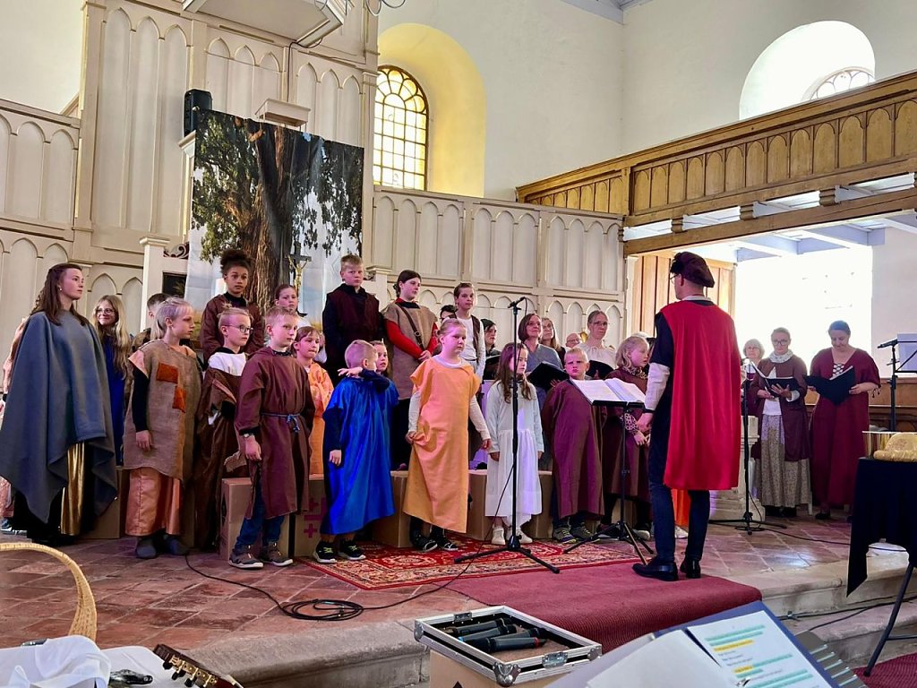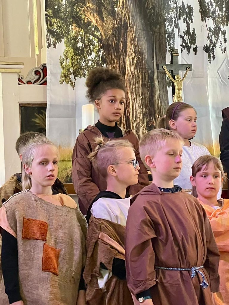 Von außerhalb kam die musikalische und technische Unterstützung. Dennis Buntfuß von der Jugendkirche besorgte die Technik, so dass die vielen Zuhörer in der Kirche Mackenrode am Sonntag, den 16. Juni, auch gut hören konnten. Am E-Piano Norbert Patzelt, der in der Region die Orgelschule betreut, und an der Querflöte Louisa Germer aus Bleicherode hielten Knut Schürmann, der die Chöre dirigierte, sozusagen den Rücken frei. Dieser hatte allerdings, neben Hildigund Neubert aus Limlingerode, noch eine Nebenrolle für Erwachsene auszuführen, die beiden waren in der Geschicht die skeptischen Eltern des Franziskus.