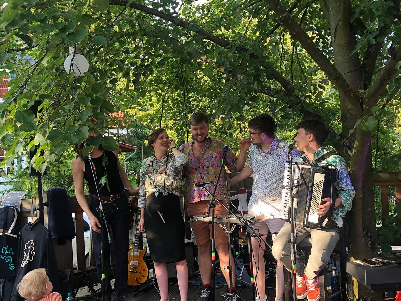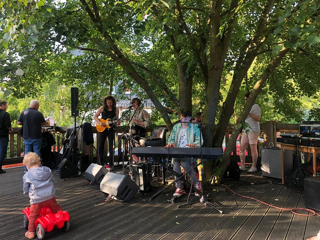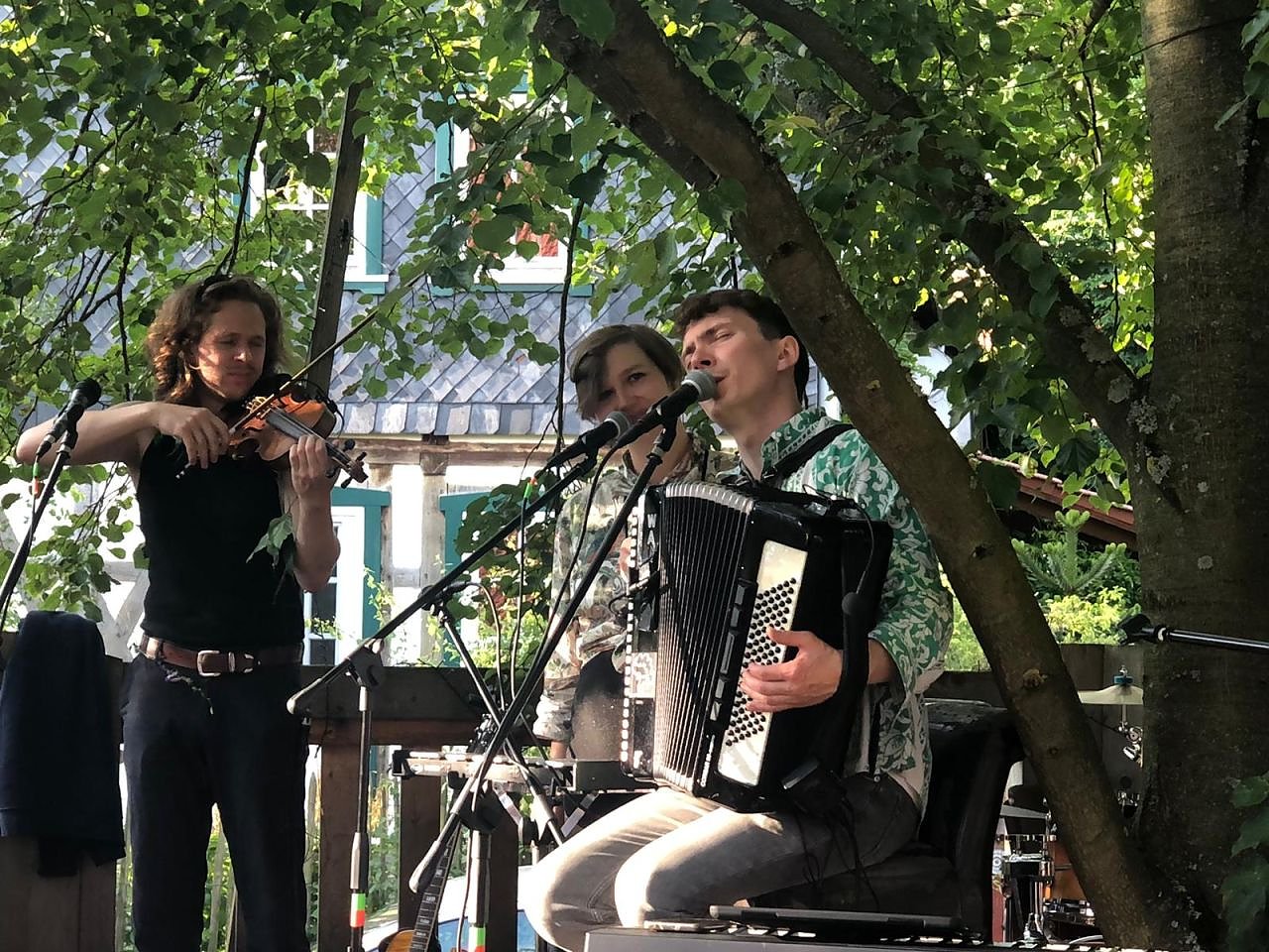 Zu den zarten melancholischen Klängen und poetischen Texten spielte die Abendsonne durch die Blätter und wiegten sich die Tänzer in der Baumkrone hinter den Horizont, nach Berlin oder Riga, ganz nah ans Paradies oder einfach "Hinter die (der)nächste (n) Biege". Die Kinder chillten dazwischen auf ihren Bobycards. Im nächsten Moment ging die Post ab, es wurde "Kaffee" serviert und dann gab es keinen Halt mehr bei der noch nicht veröffentlichten "Gurke".