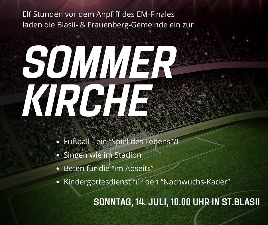 Am Sonntag (14.7.) um 10.00 Uhr ist Anpfiff zur EM-Sommerkirche in St.Blasii!! Jesus im Sturm 😉- oder als großer Verteidiger? Jedenfalls: "You´ll never walk alone"!