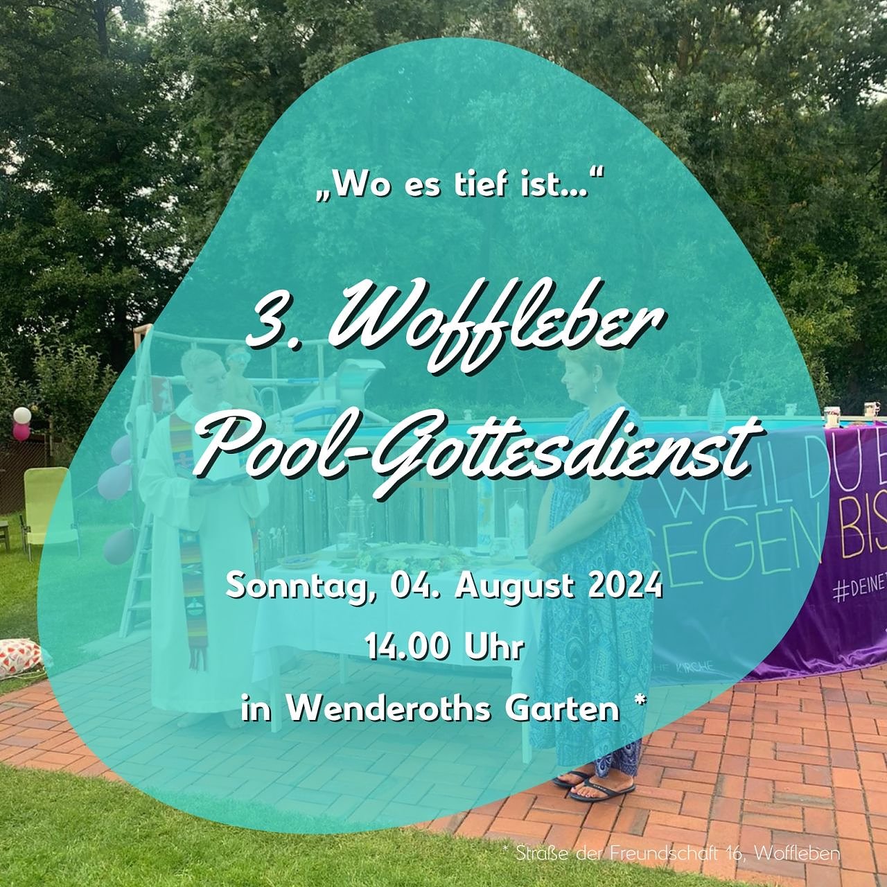 Seid alle herzlich eingeladen am Sonntag, den 04.08.2024, um 14.00 Uhr, sich am und im Pool, im Garten der Familie Wenderoth, seelisch und körperlich erfrischen zu lassen. Dabei wollen wir gemeinsam ergründen Wo es tief ist....