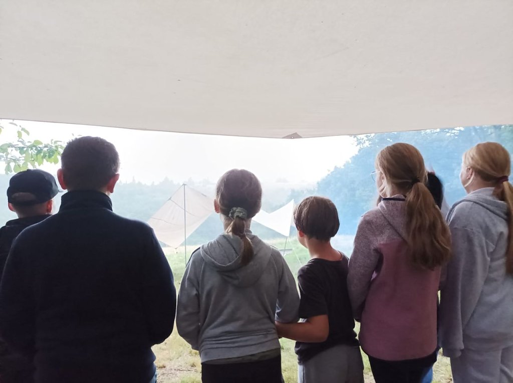 Trotz einer kurzen Regenhusche ließen wir uns die Stimmung nicht verderben und starteten voller Vorfreude zur Nachtwanderung. Ausgerüstet mit Taschenlampen ging es durch den Wald zur Burgruine Ebersburg – ein Abenteuer, auf das sich alle gefreut hatten.