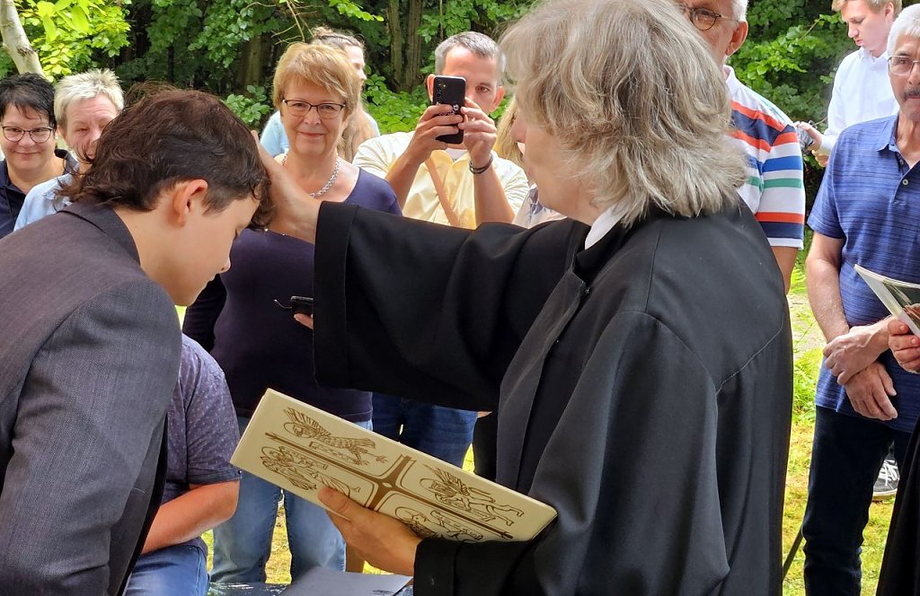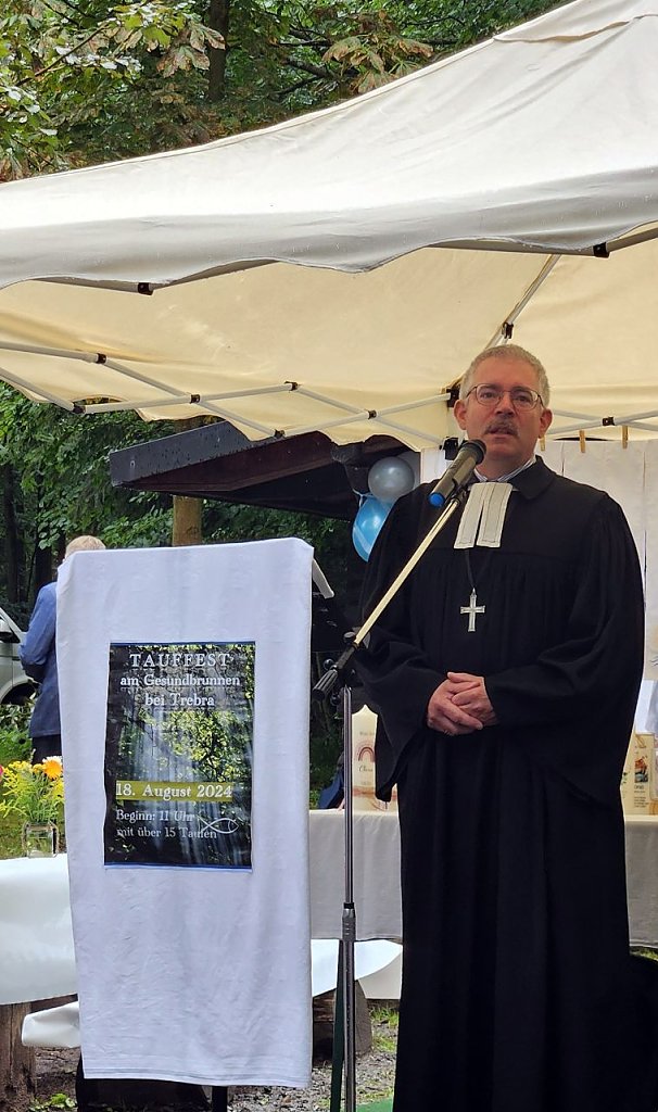 Trebra. Im Neuen Testament lesen wir an verschiedenen Stellen, dass sich jemand mit seinem ganzen Haus taufen lässt, erklärt Superintendent Andreas Schwarze. Am Sonntag am Gesundbrunnen in Trebra beim großen Tauffest der Region sei genau dies deutlich spürbar gewesen, blickt er begeistert zurück. Da erzählt Pfarrer i.R. Ehrhart Neubert in seiner Predigt von der Taufe der Oma einer Familie. Die Enkelin und ihre beiden Kinder tun es ihnen am Sonntag mitten im Wald gleich. Bei anderen sind es Geschwister oder ein Ehepaar, die gemeinsam das Sakrament empfangen. Das erlebt man nicht allzu oft, betont ein sichtlich erfreuter Superintendent. Insgesamt 19 Menschen, im Alter von 11 Wochen bis zu einem Ehepaar im Rentenalter haben sich mit dem frischen Wasser des Gesundbrunnens taufen lassen. Willkommen in euren Gemeinden, willkommen in der großen Gemeinschaft der Christen weltweit!