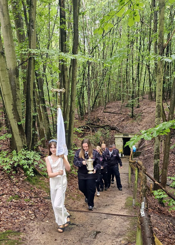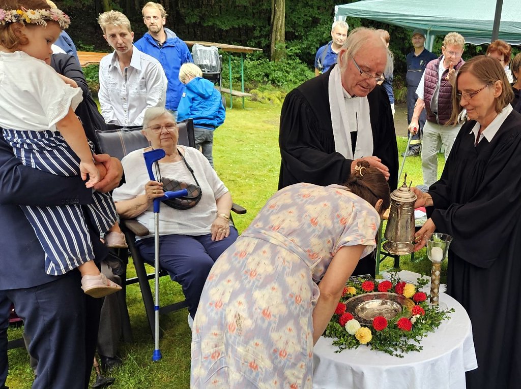 Das war ein stärkender Moment für die Christinnen und Christen der Region. Ein Fest des Glaubens, unterstreicht Andreas Schwarze. Menschen strömen herbei - die kleine Lichtung steht voller Pavillons, die sich trotz des anfänglichen heftigen Regens schnell füllen. Durch die farbigen Markierungen finden die Taufgesellschaften schnell ihr Zelt. Drei hat man für sie errichtet – in der Mitte je ein kleiner Altar mit der blumengeschmückten Taufschale, viele Bänke rundherum. Und sogar geregnet hat es ab Punkt 11 Uhr nicht mehr. Unzählige fleißige Hände haben all dies noch am Morgen aufgebaut. Die Feuerwehr Trebra immer dabei. Sie organisiert auch die Parkplätze und holt im Gottesdienst das Wasser aus dem Gesundbrunnen. Ihnen voran geht Heidi mit einem Kreuz. Sie selbst ist vor 7 Jahren beim letzten Tauffest in Mackenrode getauft worden.