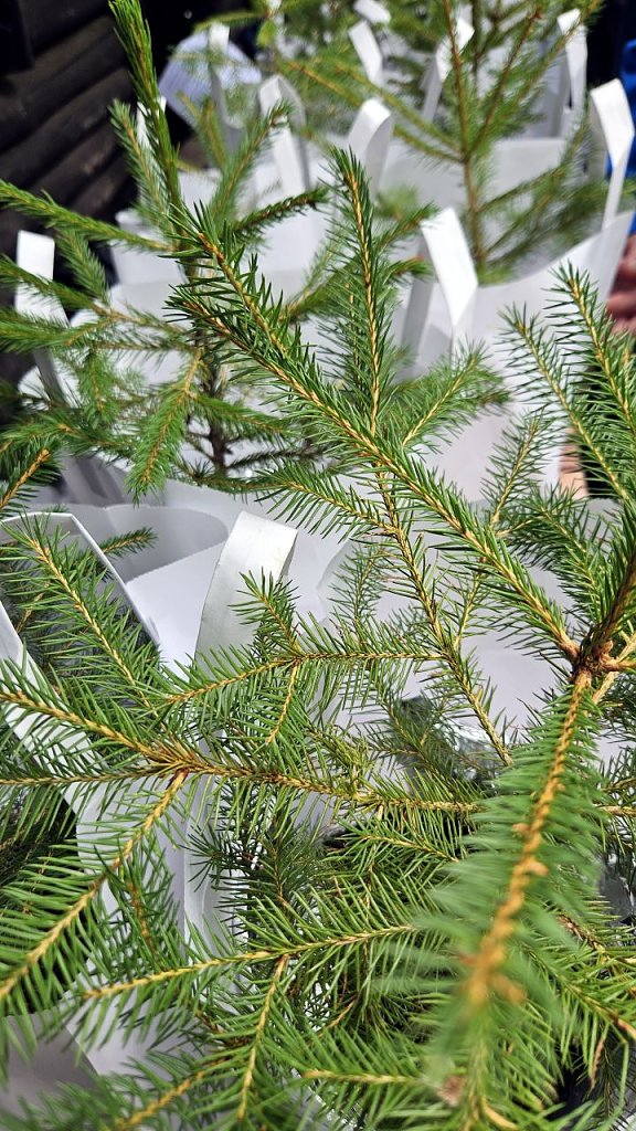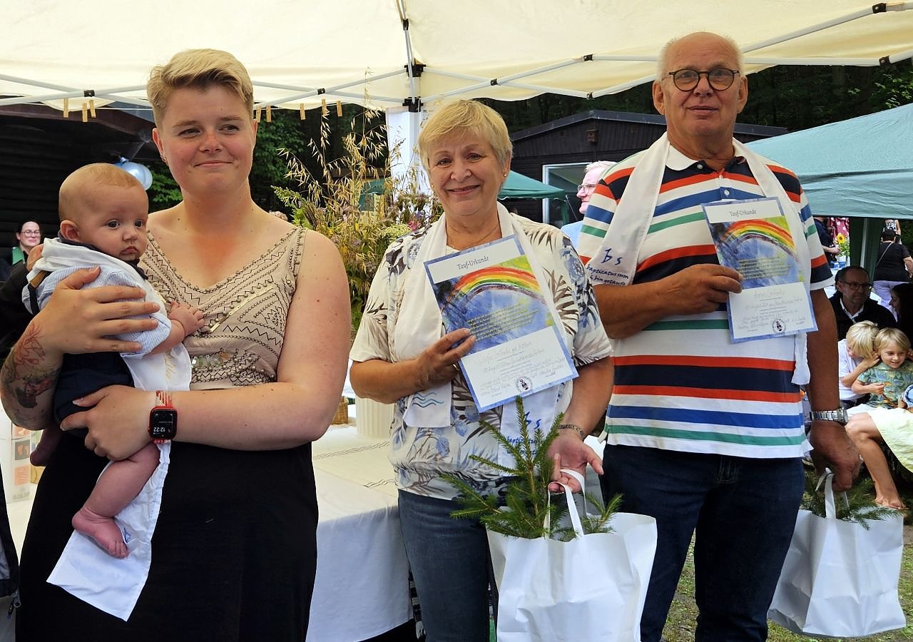 Nicht nur das frische, kühle Brunnenwasser dürfte die Täuflinge überrascht haben – auch ein bestickter Taufschal und eine kleine Fichte werden ihnen überreicht. Ein Tauffest im Wald, da liegt auch dessen Wachsen und Gedeihen nahe. Die Forstbetriebsgemeinschaft Trebra (die auch ansonsten immer helfend zur Seite steht) hat die kleinen Bäumchen gesponsert, sie kommen direkt aus dem Wald rundherum.