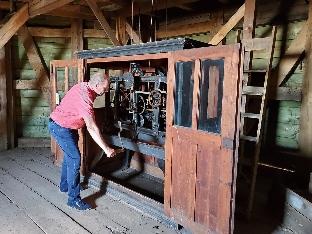 Jochen Bühling vom Kirchbauverein zieht die Uhr auf (Foto: O. Prophet)