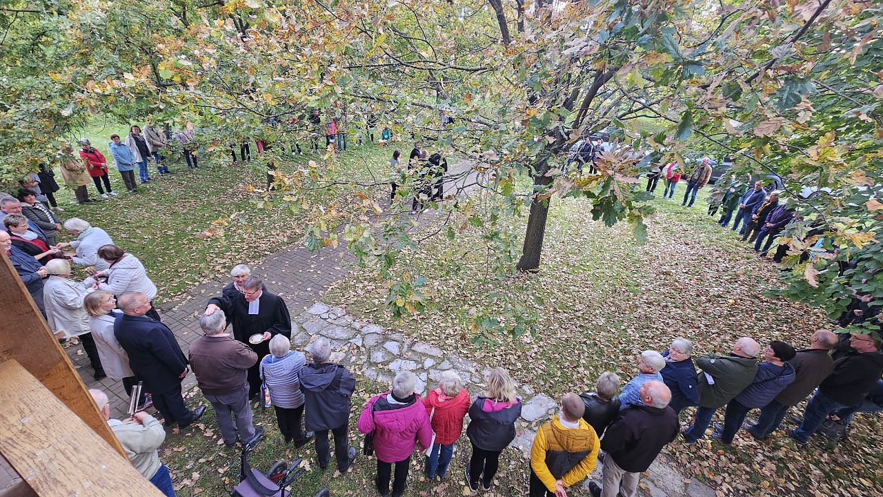 Am Sonntag nun der Abschied aus dem Pfarrbereich Heringen. Die Windehäuser Kirche war so voll, dass die Gemeinden das Abendmahl im Freien feierten. Im großen Rund beisammen standen sie im herbstlichen Sonnenschein.