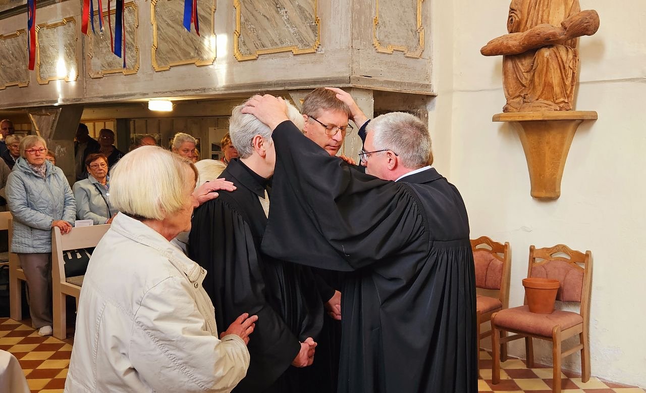 Doch bevor es hinausging segnete Superintendent Andreas Schwarze das Pfarrehepaar - an ihrer Seite Gemeindemitglieder aus diesem Bereich.