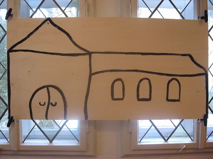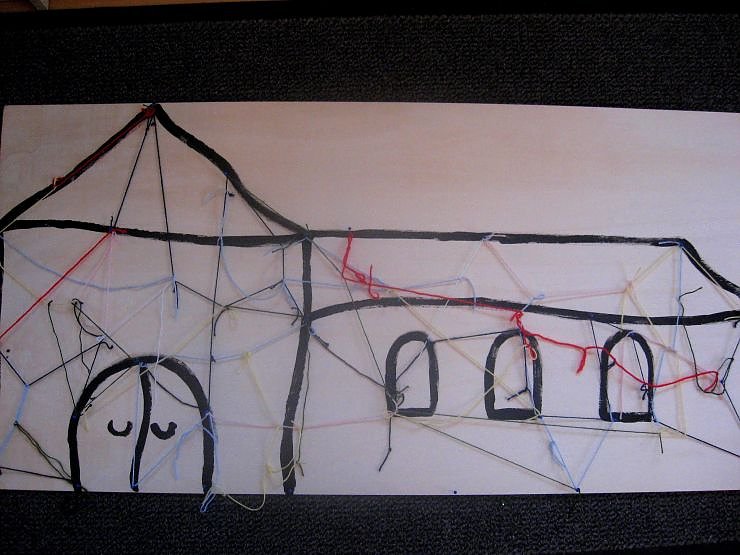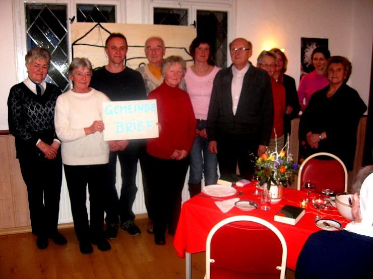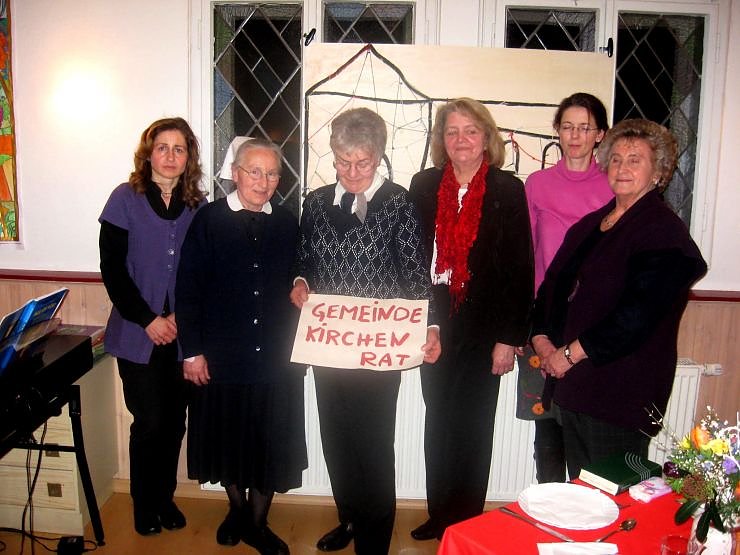 In einem zweiten Teil wurde dann wirklich, im wahrsten Sinne des Wortes, ein Netz geknüpft – das Netz Gemeinde. Die farbigen Bänder waren nämlich je nach Aufgabenbereichen ausgeteilt worden und wurden jetzt zu einem großen Netz zusammengeknüpft. Vorher wurde noch so Mancherlei aus den Tätigkeitsfeldern berichtet.