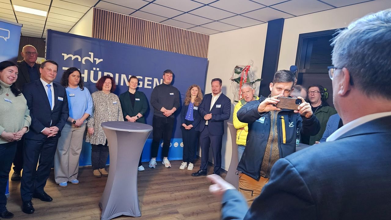 (re) Studio-Eröffnung des MDR Thüringen in Leinefelde mit Segen! Eingeladen sind, die beiden Superintendenten Christian Beuchel und Andreas Schwarze mit ihrer Öffentlichkeitsarbeiterin. Die schönen hellen Räume füllen sich schnell, ein fröhliches Miteinander nimmt seinen Lauf. Intensive Gespräche an allen Tischen und in allen Räumen - Networking + Studioerkundung. Dann bei der offiziellen Eröffnung der ganz besondere Moment - Superintendent Christian Beuchel spricht für das versammelte Team den Segen. Die Stadt gehört zu seinem Kirchenkreis. Das war zuvor nicht abgesprochen - nur eine Anfrage, der zugestimmt wurde. Vielleicht die 1. Studioeröffnung mit Segen? Die Arbeit der Redakteurinnen und Redakteure ist nicht immer leicht und angenehm, dabei unter Gottes Schutz und Schirm zu stehen - für manche ganz sicher ein guter Gedanke.