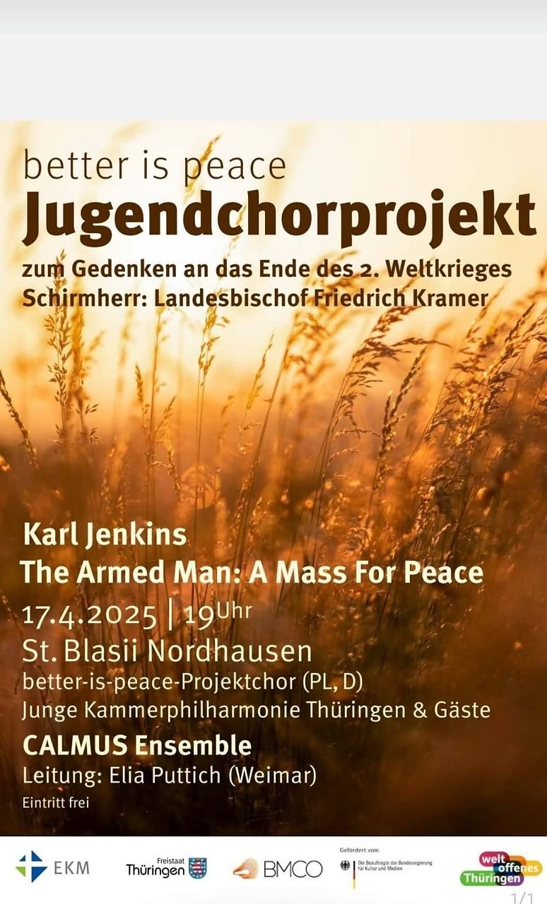Better is peace - Frieden ist besser! Unter diesem Motto gastieren am Gründonnerstag ein internationaler Projekt-Jugendchor sowie Mitglieder der Jungen Kammerphilharmonie Thüringen und das weltberühmte Calmus-Ensemble in der Blasii-Kirche Nordhausen. Wie schwierig Frieden in unseren Zeiten ist, zeigt das einstudierte Stück - "The Armed Man - A Mass for Peace" von Karl Jenkins. Das Stück zeigt die Angst vor dem Krieg, die Schrecken des Kriegs und die Hoffnung auf Frieden. 100 Jugendliche aus der Landeskirche, aus Polen und Frankreich haben das Werk gemeinsam einstudiert. Der Eintritt ist frei, um eine großzügige Spende zur Deckung der Unkosten wird herzlich gebeten.