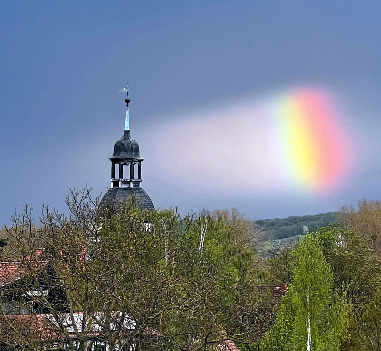 (re) Diana Kupfer berichtet: "Am Ostermontagabend konnten die Sundhäuser einen Regenbogen über ihrer Kirchturmspitze bewundern und etwas später einen Lichtspot, der wahrscheinlich daran erinnern sollte, dass dieser Kirchturm dringend einer Sanierung bedarf.