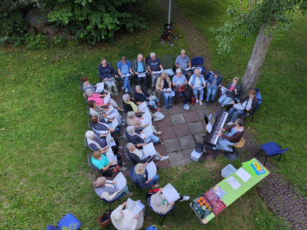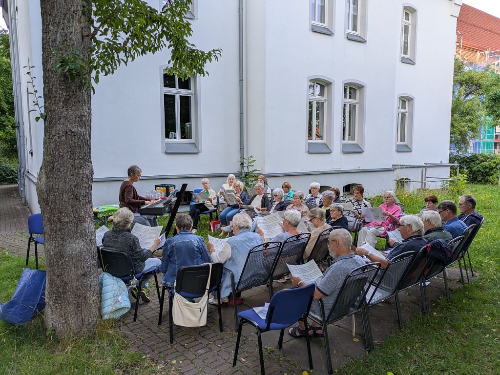 Am Samstag, 26.7., wird um 17 Uhr in die Neustädter Kirche zum Abschluss der Sommerchorreihe eingeladen. An vier Dienstagen trafen sich ca. 30 Sänger und Sängerinnen zum gemeinsamen Singen. Unter der Leitung von Kreiskantorin Christine Heimrich erklangen Kanons und Volkslieder, sowie alte und neue Kirchenlieder in den Kirchgärten in Ilfeld und Woffleben und am letzten Dienstag im Bonhöfferhaus in Niedersachswerfen. Als Abschluss versammelt sich der Sommerchor am Samstag, 26.7., um 17 Uhr in der Neustädter Kirche und lädt zum Zuhören und Mitsingen ein. Dieses Chorprojekt findet schon mit großem Erfolg das 2. Jahr statt. Neu war diesmal, dass an verschiedenen Orten gesungen wurde. In den Proben wurde auch ein besonderes Lied eingeübt- ein Teil des Sommerchores unterstützt eine Theateraufführung im TheaterINatur in Benneckenstein. Bei Requiem for a Car am 16.8. um 18 Uhr stehen einige auf der Waldbühne als Mitwirkende.