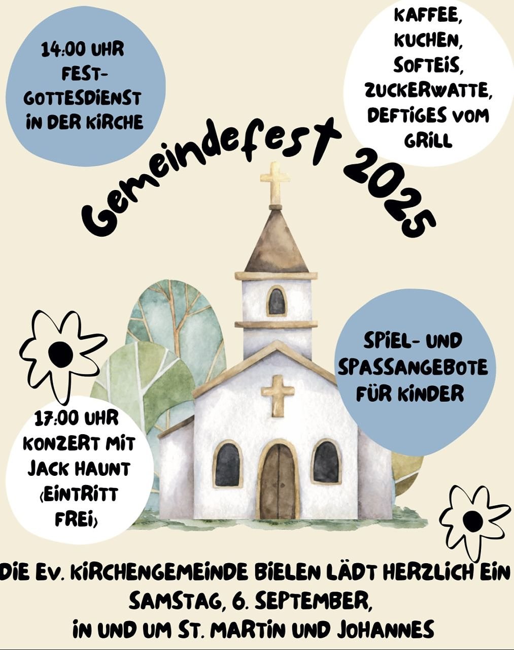 ein buntes Fest für alle Generationen im Kirchgarten geplant. Ein großes Kuchenbuffet, ein Eiswagen und echte Bielsche Zuckerwatte warten bei musikalischer Umrahmung im Kirchgarten auf die Besucherinnen und Besucher.