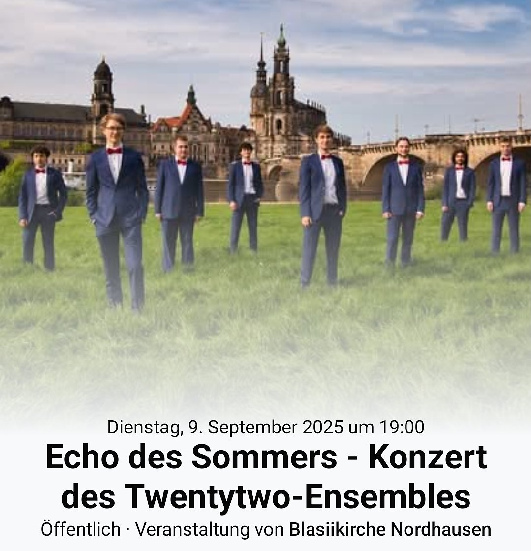 (re) "Unter dem poetischen Titel Echo des Sommers begibt sich das twentytwo-ensemble bereits zum vierten Mal auf Tournee durch ganz Deutschland. Die zehn jungen Männer präsentieren ein neues, facettenreiches Programm, das sowohl musikalisch als auch atmosphärisch begeistert.