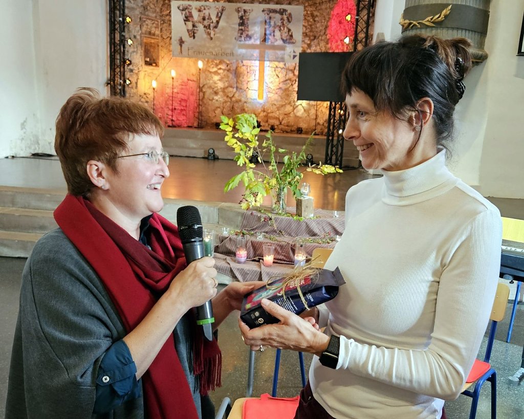 Pfarrerin Eva Lange, leitende Pfarrerin der Evangelischen Frauen in Mitteldeutschland, öffnete mit ihren theologischen Gedanken zu Maria und Martha neue Perspektiven auf diese bekannte biblische Geschichte. Ihre Ausführungen zeigten, wie aktuell und kraftvoll diese Frauenfiguren für unser heutiges Gemeindeleben sind. Besonders spannend war die Frage, ob Martha nicht mehr war als die Hausfrau, wie sie heute gern dargestellt wird, sondern eher die Leiterin einer christlichen Hausgemeinde – eine Deutung, die viele zum Nachdenken brachte. Die Bedeutung der Worte in ihrer Ursprungszeit in die Deutung der Geschichte mit einzubeziehen, verändert den Blick. Johannes 11 und Lukas 10 wurden dazu betrachtet, immer die Auslegung des Wortes diakonia im Blick – ist es später korrekt übersetzt worden? Heißt diakonia nicht eher das Ausführen von Aufträgen im Sinne des Apostelamtes, der Mission, der Verkündigung?