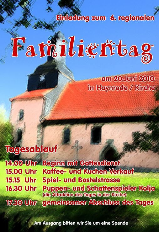 Als Höhepunkt tritt am Nachmittag in der Kirche ein Puppenspieler mit einem Schattenspiel auf, bevor der Familientag mit einer Andacht beendet wird.