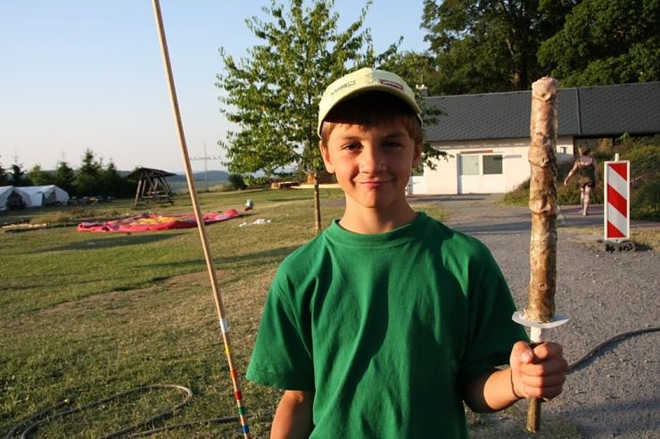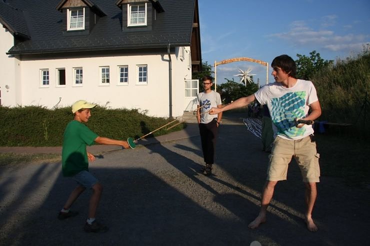 Christian und Henning unser traumhaftes Dreamteam wollen nicht mehr länger unbewaffnet übers Campgelände ziehen. Bei den Howdy Haudegen basteln sie sich einen Degen. Christian, was machst du hier? Weiß nicht! Hier fehlt ne Feile. War es deine Idee einen Degen zu bauen? Ja! Wer ist dein Lieblingsmitarbeiter? (Wendet sich von uns ab) Komm, Henning. Kann man euch auch getrennt hier antreffen? Nur beim Mittagsschlaf.