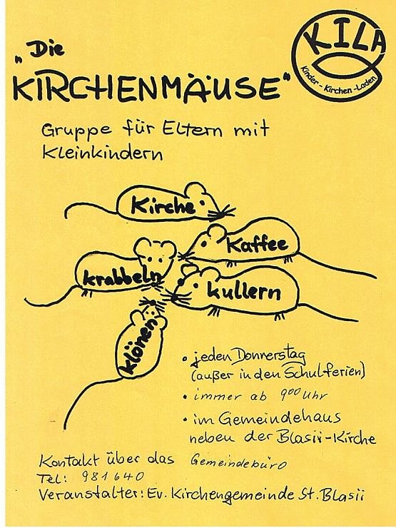 Pünktlich zum beginnenden Herbst krabbeln wieder Kirchenmäuse durch die Räume des KILA neben der Nordhäuser Blasii - Kirche. Die Krabbelgruppe der Gemeinde trifft sich wieder jeden Donnerstag, außer in den Ferien, um 9.00 Uhr, um bei Tee und Keksen ins Gespräch zu kommen. Neue Mäuse sind jederzeit herzlich willkommen!