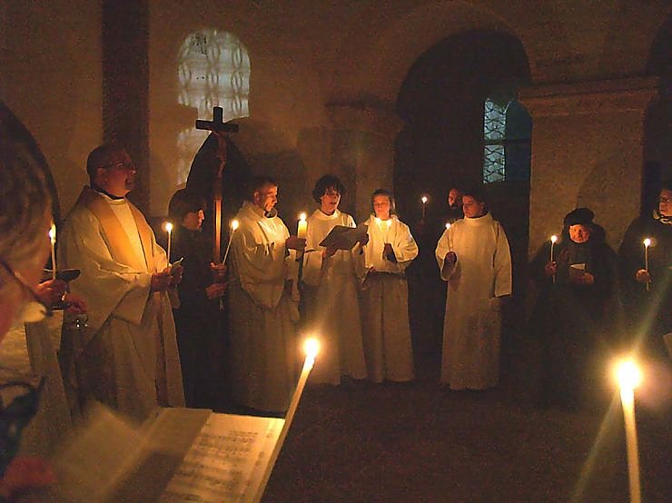 In alter Tradition treffen wir uns am Osterfeuer vor der Kirche - an ihm wird die Osterkerze entzündet und in die Kirche hineingetragen. Der Gottesdienst selber ist eine Prozession mit verschiedenen Stationen im Kirchenraum.