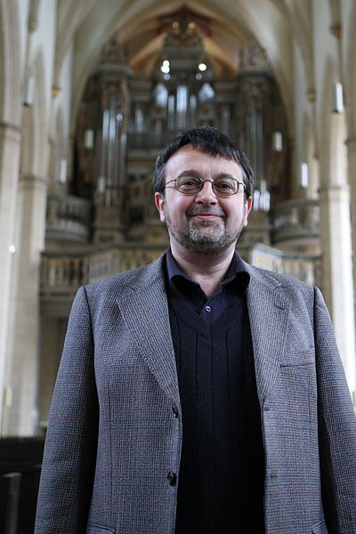 KMD Prof. Matthias Dreißig vor "seiner" Orgel (Foto: www.kirchenmusik-erfurt.de)
