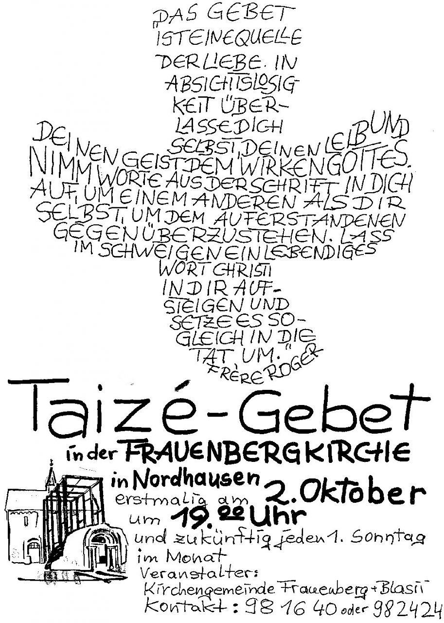 Diese "Kraft-Tankstelle" soll nun auch in Nordhausen spürbar werden: einfache Gesänge, meditatives Gebet und Stille vor dem Kreuz aus Taizé können sammeln und stärken für eine neue Woche. Alle, die die einprägsamen Gesänge aus Taizé schon lange mögen oder die diese Form des Gebets einfach miterleben und ausprobieren möchten, sind herzlich eingeladen: am Sonntag, dem 02. Oktober um 19.00 Uhr in der Frauenberg-Kirche - und dann jeden ersten Sonntag im Monat!