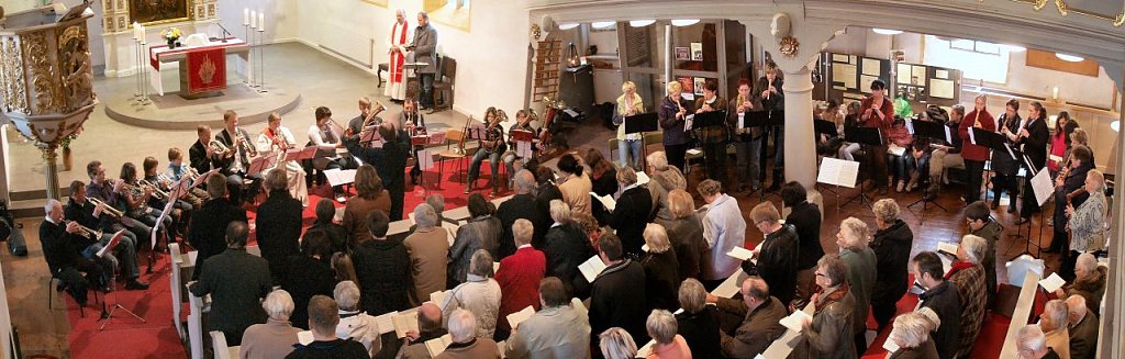 Getreu diesem Motto waren nicht weniger als 20 Flötenspieler und 17 Bläser zum Gottesdienst versammelt, Kantorin i.R. Marianne Zarft saß an der Orgel und Kantor Carsten Miseler dirigierte das ganze.