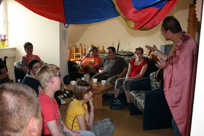 Am 23. Mai verwandelte sich der Gruppenraum der Ambulanten Dienste in ein orientalisches Wüstenzelt. Beschirmt vom bunten Zeltdach saßen die Teilnehmer/innen der Freizeit "Kochen und Genießen mit der Bibel" auf kleinen Hockern und Schemeln, versammelt um kleine Tische. Sie lauschten der Geschichte eines Gastes aus ferner Zeit. Von Gastfreundschaft erzählte er. Davon, wie man im Orient einen Fremden willkommen heißt. Davon, dass man dem Gast immer das Doppelte von dem geben soll, was er erbittet. So wie Rebekka, eine Frau aus der Bibel, dem Fremden am Brunnen einen Krug Wasser reicht, als er um eine Hand voll Wasser bittet. Und dann machten sich auch die Teilnehmerinnen der Freizeit daran, Gastfreundschaft zu leben. Während die einen in der Küche eine biblische Mahlzeit mit duftenden Gewürzen und frischem Brot zubereiteten, deckten andere die Tische oder saßem beim Gespräch zusammen. Wie im Orient üblich gab es vor dem Essen eine Hand- und Fußwaschung. Nach dem gemeinsamen Segenslied ließen es sich alle gut schmecken. Ein hebräisches Lied ließ nach dem Essen die Füße der Teilnehmenden tanzen. Bevor alle sich auf den Heimweg machten, bekam jeder den Segen Gottes mit einem duftenden Öl auf der Stirn zugesprochen.