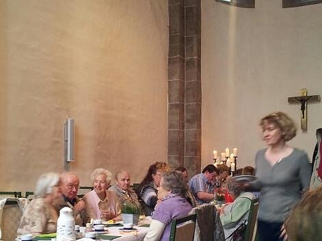 Die Tische sind wieder weggeräumt, die Stühle wieder auf ihren Platz, etwa 300 Tassen, Teller, Schüsseln und Löffel gingen beim Abwasch durch meine Hände, die Kirche ist wieder aufgeräumt, das Gemeindefest am Frauenberg ist Geschichte. Eine Gute, kann ich behaupten, trotz des schlechten Wetters fanden sich rund 100 Menschen heute Nachmittag am Frauenberg ein, um Gottesdienst zu feiern und die Gemeinschaft in der Frauenberggemeinde. Pfarrer Friedmann Büttner erzählte in seiner Predigt eine Geschichte des Hundes -REX-, unterstützt durch einen -Film- den die Kinder der Gemeinde gestaltet hatten, die einlud, über sein eigenes Miteinander mit den Kreaturen Gottes nachzudenken. Es wurde viel gesungen, unsere liebe Elisabeth Szesny, Leiterin des Chors wurde verabschiedet, die ganze Gemeinde dankt Ihr für die vielen Jahre bester Kirchenmusik am Frauenberg und wünscht Ihr viel Gesundheit und Gottes Segen. Nach dem Gottesdienst folgte ein kleines Ständchen des Chores über das Leben als Frosch und dann gab es reichlich Kaffee und Kuchen für alle hungrigen Mägen, es wurde viel erzählt, sogar eine Partie Schach gespielt, also unter dem Strich -ein guter Sonntagnachmittag am Frauenberg. An dieser Stelle vielen Dank an alle fleißigen Helfer die unser Gemeinefest ermöglicht haben.