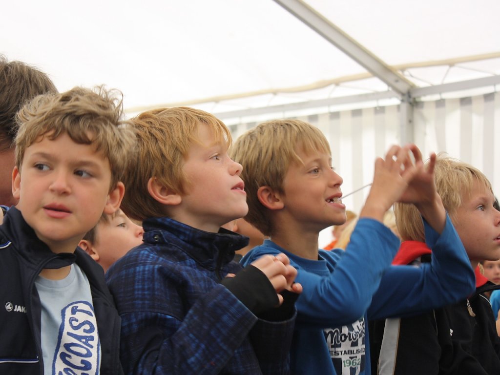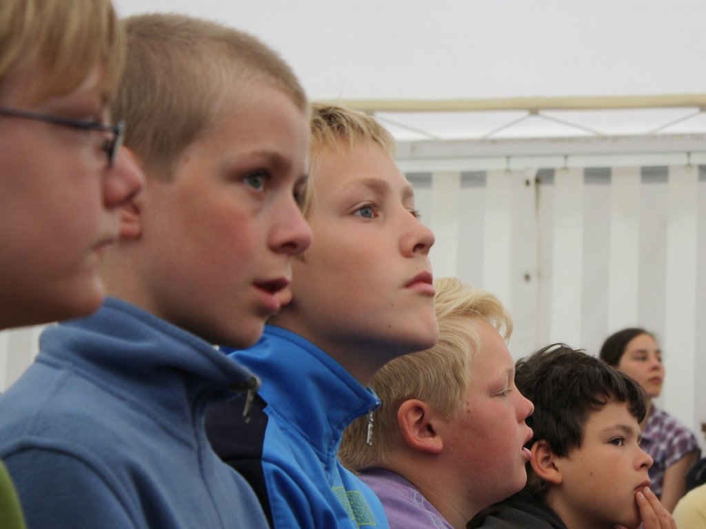 Einhundert und drei hungrige und teilweise ausgeschlafene Lambarener ziehen gemeinsam singend ins große Zelt. Frühstück!