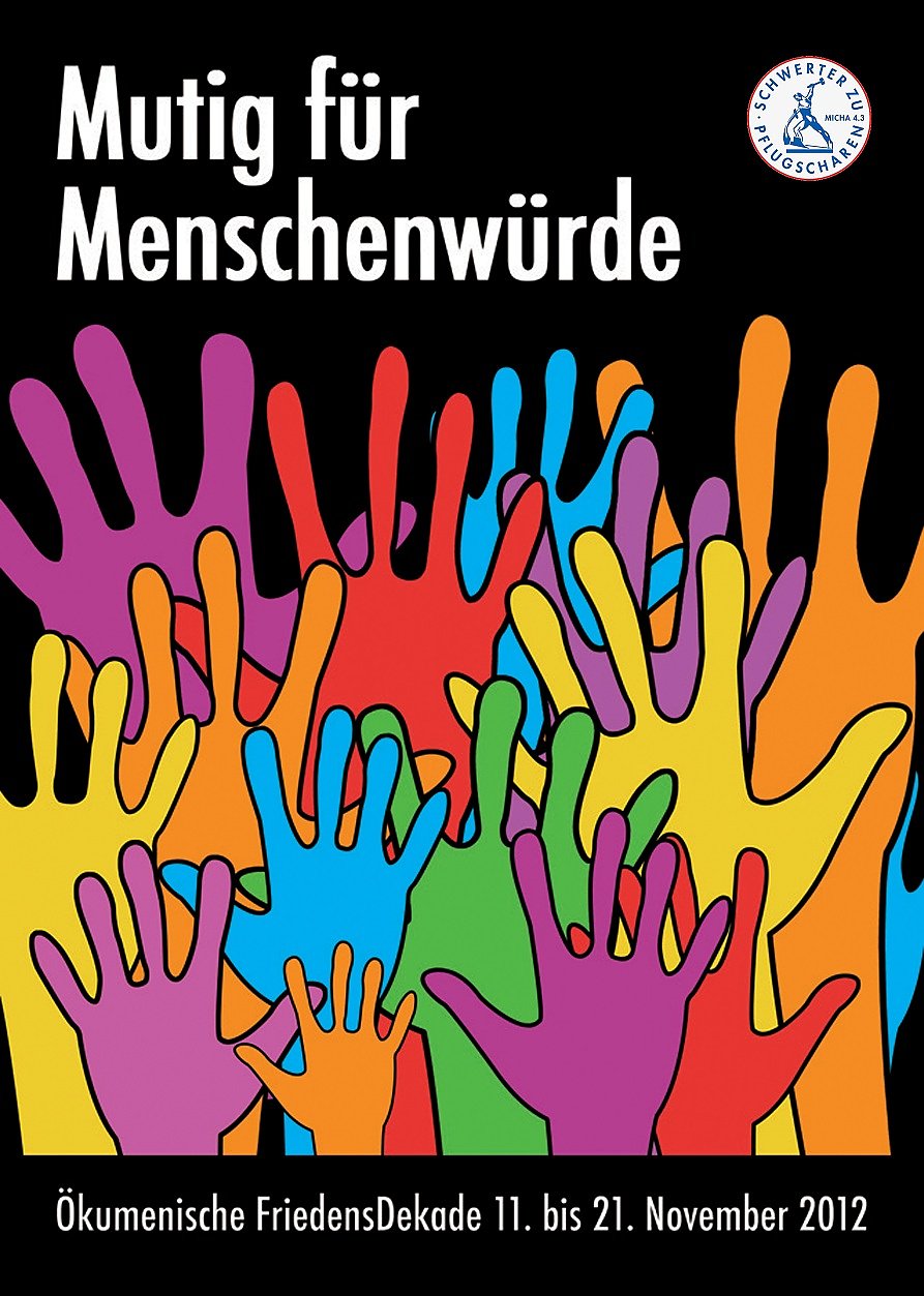 Mutig für Menschenwürde lautet das Motto der Friedensdekade 2012. Dieses Leitwort erinnert an die enge Beziehung, die den Gedanken der Menschenwürde mit unserem Glauben verbindet. Als Christinnen und Christen ist uns eine besondere Hochachtung der Menschenwürde aufgetragen, denn wir sind gewiss: Jeder Mensch trägt seinen einzigartigen Wert in sich selbst, weil er als Gottes Ebenbild an der Lebensfreundlichkeit des Schöpfers Anteil hat und weil die Liebe Gottes allen seinen Kindern gilt.