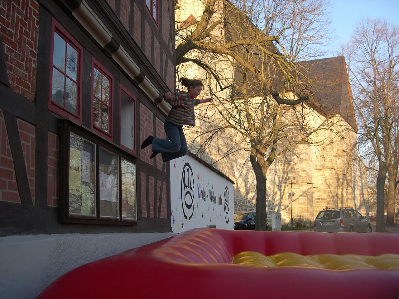 Trotz des frühlingshaften Wetters sind dicke Strümpfe zu empfehlen, da das Hüpfkissen nur ohne Schuhe betreten werden darf. Das Hüpfkissen kann beim KILA übrigens auch für Kindergeburtstage oder ähnliche Veranstaltungen zu einem günstigen Tarif gemietet werden. Infos bei Gemeindepädagpoge Frank Tuschy unter 988340