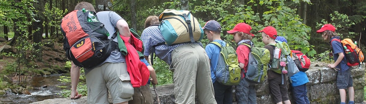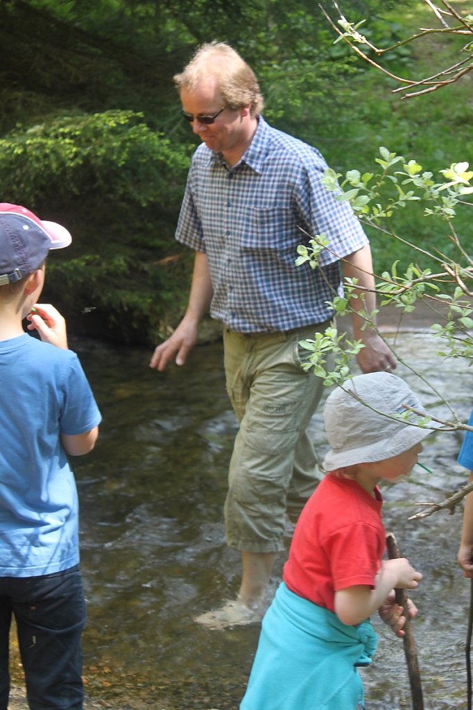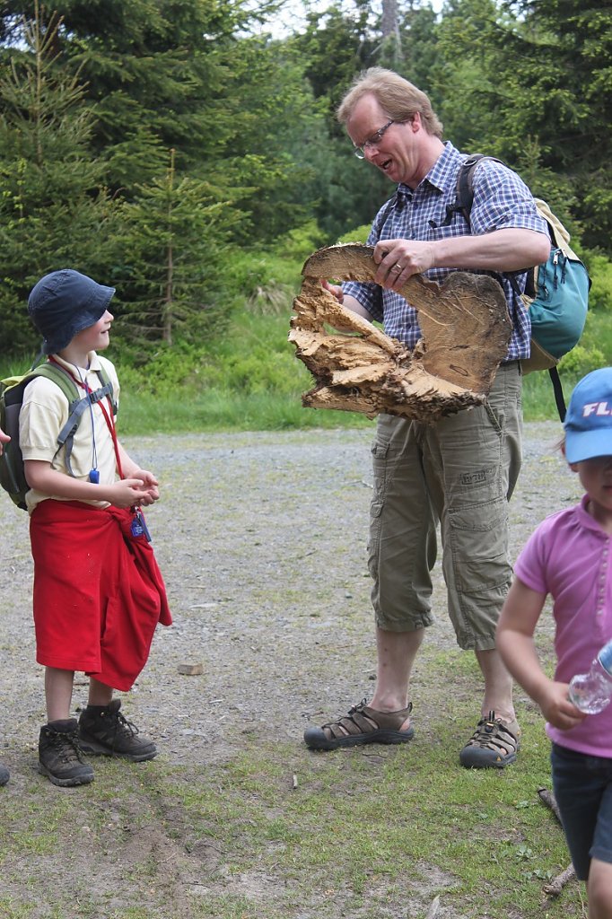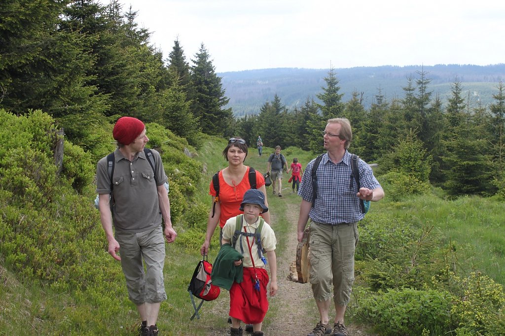 Nachdem nach kurzer Verspätung der Familie des Fährtenlesers, alle beisammen waren, die standesgemäß herzliche und ausführliche Begrüßung beendet, alle Schnürsenkel festgezogen, sowie alle Rucksäcke verzurrt waren, ging es los, gemäß der Reihenfolge Ihres Standes, die Kleinsten, natürlich nur bezogen auf Ihre körperliche Länge, an der Spitze des Entdeckerzuges, der Hofstaat folgte in zum Teil loser, weit voneinander entfernten Formation, unter Austausch der einen oder anderen mündlichen Information. Unser zu jeder Zeit sach- und fachkundiger Führer, führte unsere Schritte entlang, reißender Flüsse, in dem unser kleiner Entdecker Johannes, ein erfrischendes Bad nahm, um sich von der hervorragenden, recht frischen, aber doch glasklaren Qualität, des Harzwassers zu überzeugen, turmhochgestapelter Felsformationen, auf den natürlich unser kleiner Entdecker Johannes, wenn auch mittlerweile ohne männlichen Beinkleid, seine weit bekannten Kletterkünste unter Beweis stellte, tiefer Schluchten und hoher Berge, durch die der kleine Entdecker Johannes, mit zwar kurzen Beinen, aber dennoch heldenhaft sich den Weg suchte, bis hin zu einer sicheren Raststätte, an der der Hofschenk verstärkt durch die liebreizenden Damen der ehrenwerten Gesellschaft, eine für alle geschundenen Körper, köstliche und reichhaltige Speisung bereithielt.