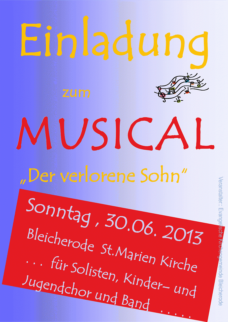 Am Sonntag, dem 30. Juni, um 15 Uhr wird die Luft in der Bleicheröder St. Marien-Kirche von Gesang und Musik erfüllt sein. 35 Kinder singen, tanzen und spielen, dazu eine Band und Bläser. Innige Lieder über Freiheit und Verlust, rockige und ausdrucksstarke Stücke über Geiz und Großzügigkeit, spannende Dialoge über Enttäuschung, Hoffnung und Liebe - alles zu hören im Musical "Der verlorene Sohn".
