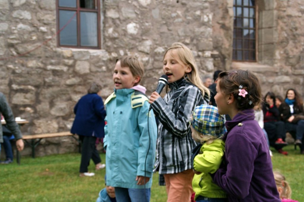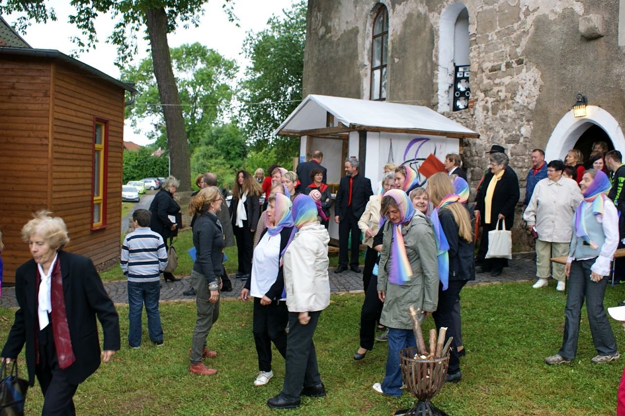 So wurde nach einem bunten wunderschönen Chorkonzert in der gut besuchten Kirche, mit Darbietungen der Chöre "Neue Hofmusik" aus Neuhof , "Karibu" aus Nordhausen, dem Gemischten Chor Ellrich e.V. und den Kirchenchören aus Unseburg und Liebenrode, ein "Petrus-Musical" auf dem Kirchplatz aufgeführt. Petrus selbst, hatte nach ein paar Tränen der Rührung (der Himmel war grau und tropfte am Vormittag unentwegt) vergossen, bevor er ein Einsehen hatte und die Wolken wegschob.