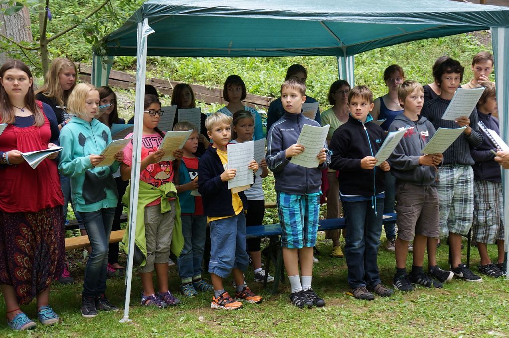 Das war der richtige Raum für Capella juventa und ihre Musik. Ca. 50 Besucher waren gekommen, um diesen besonderen Gottesdienst zu erleben. Fast wollte es anfangen zu regnen. Aber nachdem von Wundern aus der Bibel zu hören war, die Jesus auf seinem Weg durch Galliäa tat, geschah auch hier vor Ort ein kleines Wunder. Denn alle Menschen und Instrumente blieben im Wesentlichen trocken.