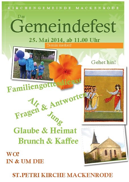 Das diesjährige Gemeindefest beginnt am 25. Mai 2014 um 11.00 Uhr mit einem Familiengottesdienst zum Thema "Gehet hin!", zur Aussendung der Jünger Jesu.