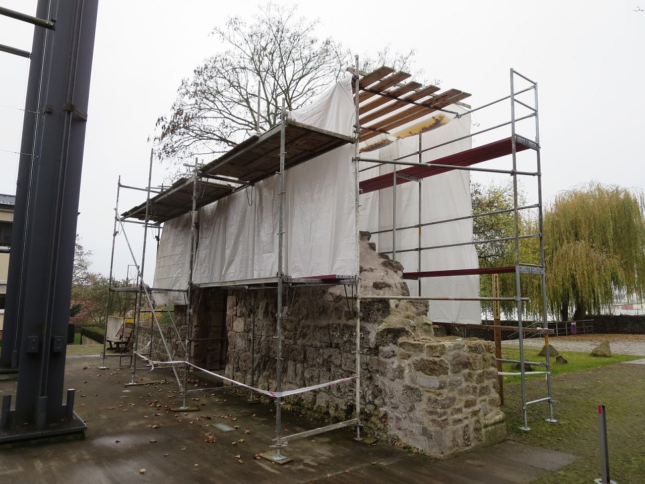 Seit über einem Jahr ist das wertvolle romanische Portal, der ehemalige Eingang in die Frauenberg-Kirche, eingehaust, um Regen und Schnee vom Bauwerk fernzuhalten und so dem weiteren Verfall zu wehren.