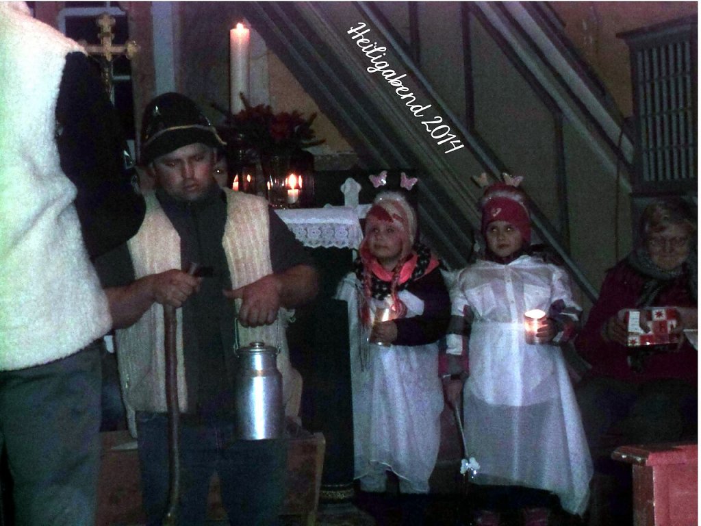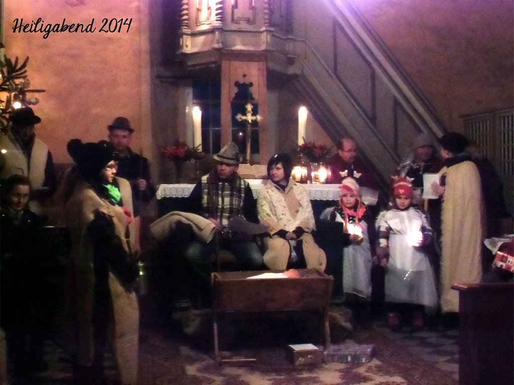 Zur Freude aller übernahmen in diesem Jahr, neben den Erwachsenen, erstmals wieder Kinder einige Rollen. So wurden die aufmerksam schauenden und lauschenden Kirchenbesucher in die damalige Zeit vor 2014 Jahren zurückversetzt. Begleitet von den kleinen Engeln (Dina Schmeltzer und Marie-Luise Kolle) lies sich das Enkelkind (Inka Ließmann) von ihrer Großmutter (Ingrid Myler) sehr anschaulich die altbekannte Geschichte von Maria (Annika Wedler) und Josef (David Seidenstücker) erzählen. Diese waren unterwegs nach Betlehem wo sie am Abend nach einer Unterkunft suchten. Die herzlose Herbergswirtin (Elke Wedler) wies sie aber ab, letztendlich gewährte ihnen eine Wirtin (Katja Sachse) dann Zuflucht im Stall um dort ihr neugeborenes Kind in eine Krippe zu legen.