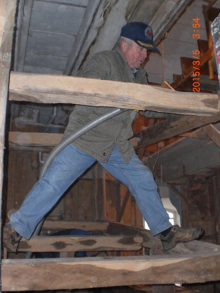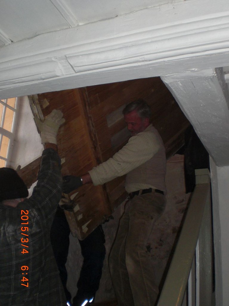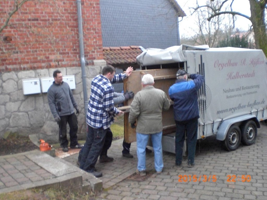 Orgelbaumeister Reinhard Hüfken und sein Geselle wurden von einer Gruppe tatkräftiger Gemeindeglieder unterstützt. Über 1000 Pfeifen, die Windladen, Tastaturen und Pedale und unzählige Teile der Mechanik wurden ausgebaut, mit Druckluft und Wasser gereinigt, verpackt und verladen. Besondere Manneskraft erforderte der Ausbau der beiden großen Blasebälge. Auch das gelang dank zahlreicher Helfer.